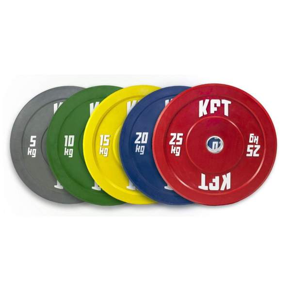 Juegos de discos para pesas KFT de color, fabricados en caucho virgen de alta densidad. Ideados para crossfit, halterofilia, etc.